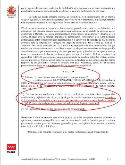 Su señoría indica que el Ayuntamiento no aportó ninguna de las pruebas solicitadas. Además, la Sentencia es muy buena por que estima la multa de 90 euros y, además, accede a la petición que le hacemos e indica que el Ayuntamiento le tiene que devolver el importe de la grúa (no recordamos ningún caso de este estilo en el que se accede, además, en la propia sentencia, a que le devuelvan los costes del depósito y la grúa):