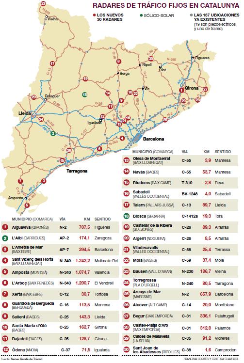 Sin embargo, este cartel todavía no se ha instalado en la C-33 en Montcada i Reixac (Vallès Occidental), donde hace pocos días que se ha cambiado de sitio el controvertido radar del que el director de Trànsit, Joan Aregio, se quejó porque no cumplía con el objetivo de que los usuarios levantaran el pie del acelerador. En ese lugar, en el kilómetro 82,5 de la carretera, se habían impuesto sanciones por valor de cinco millones de euros en solo tres años. Aregio aseguró que junto a ese había otros dos –uno en la B-23 en Molins de Rei (Baix Llobregat) y otro en la C- 16 en Navàs (Bages)– que tampoco se adaptaban al objetivo.