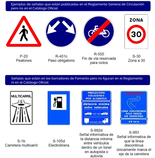 Y es que las señales que aparecen en el Reglamento General de Circulación, aprobado por el Ministerio de la Presidencia del Gobierno de España mediante el Real Decreto 1423/2003 y las del Catálogo Oficial de Señales Verticales «no son las mismas», asegura el presidente de Afasemetra, Francisco Cano.
