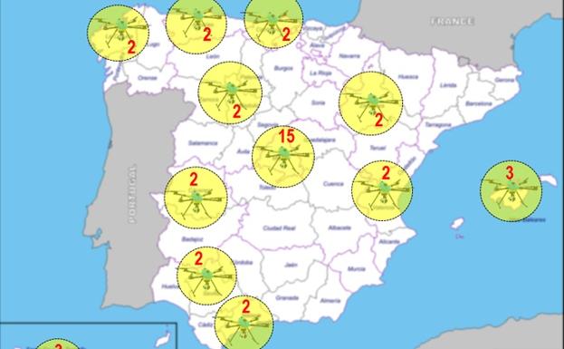 Así, a tenor de dicho mapa, durante el mes de agosto habrá dos drones en Galicia, dos en Asturias, dos en Cantabria, dos en Castilla y León, dos en Aragón, 15 en la Comunidad de Madrid y provincias aledañas, como Toledo, Guadalajara, Segovia, Ávila y Cuenca; dos en Extremadura, dos en la Comunidad Valenciana, dos entre las provincias de Málaga y Cádiz, dos entre las provincias de Huelva y Sevilla, tres en las Islas Baleares y otros tres en las Islas Canarias.